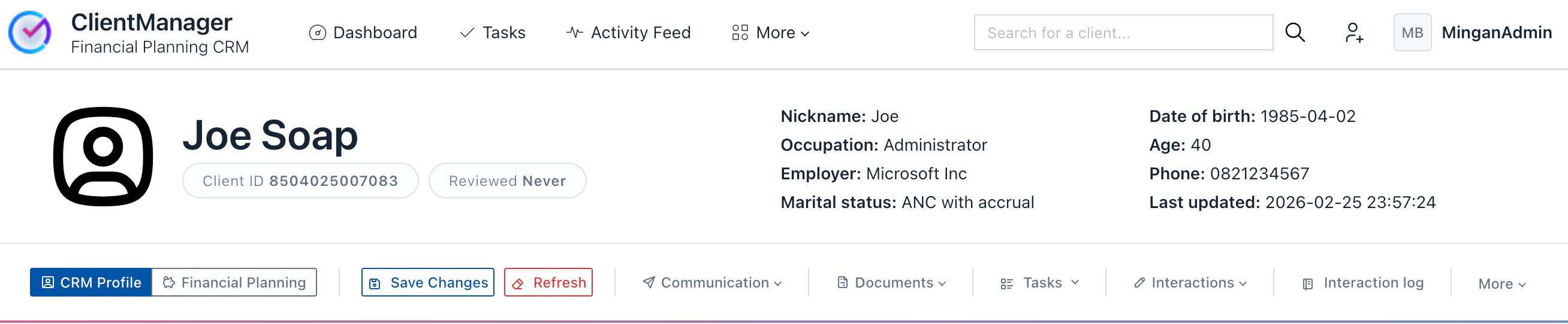 - CRM Profile – Displays the client’s personal and administrative information.